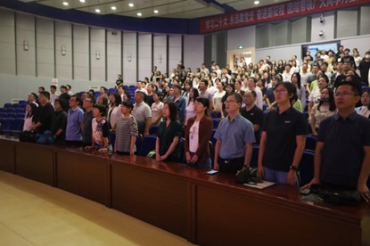 上午9点大会正式开始,首先进行第一部分—2023级MPA研究生开学典礼。典礼伊始,杜宝贵介绍了到场的领导嘉宾。介绍完毕后,与会人员全体起立奏唱国歌。在庄严肃穆的国歌声结束后,张雷院长发表了欢迎致辞,为同学们介绍了东北大学的百年校史和爱国主义传统,讲解了东北大学MPA教育的承办历史以及优秀毕业生,表达了对MPA同学的激励和期许。“聚是一团火,散做满天星”的口号深深印在了每一位参会同学的心中。