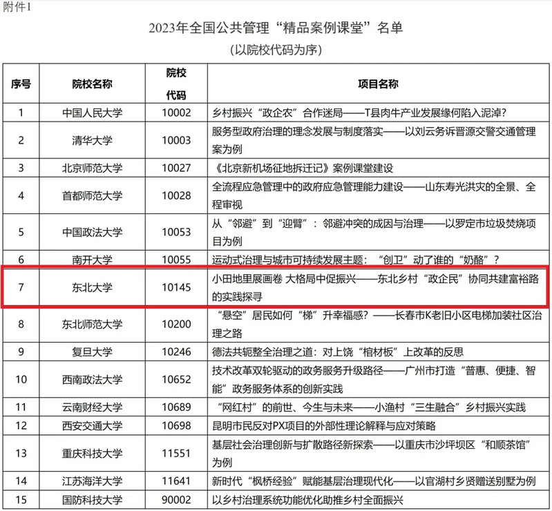 全国公共管理“精品案例课堂”项目由教育部学位与研究生教育发展中心和全国MPA教指委联合开展,旨在强化案例教学,推动教学方法创新和理念传播,探索公共管理专业学位案例教学范式,服务实践创新人才培养。2023年12月,全国MPA教指委公布了2023年全国公共管理“精品案例课堂”建设计划名单,我校张平老师团队“小田地里展画卷 大格局中促振兴——东北乡村‘政企民’协同共建富裕路的实践探寻”获得立项。经过严格的文本检查、专家评审、教指委会审议及投票等环节,结合教育部学位与研究生教育发展中心的最新部署,该项目获评全国公共管理“精品案例课堂”,全国仅获评15例。