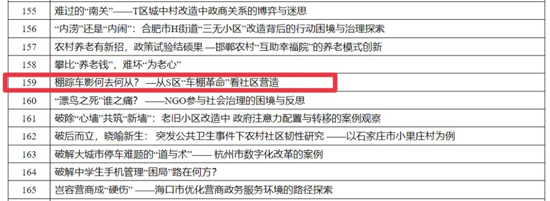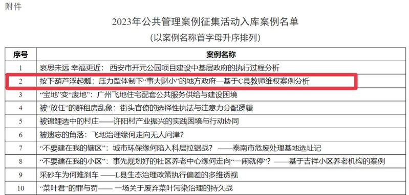 中国专业学位案例中心由教育部学位与研究生教育发展中心设立、财政部专项经费支持建设,是我国相关专业学位类别最全、特色明显、认可度高并具有一定国际知名度的国家级专业学位教学案例库,入库公共管理案例代表着公共管理专业学位教学案例的最高水平。在2023年中国专业学位案例中心公共管理案例征集活动评选中,李月娥老师指导的《棚踪车影何去何从?——从S区“车棚革命”看社区营造》、王作宝老师指导的《按下葫芦浮起瓢:压力型体制下“事大财小”的地方政府》案例双双入选中国专业学位案例中心公共管理案例库。